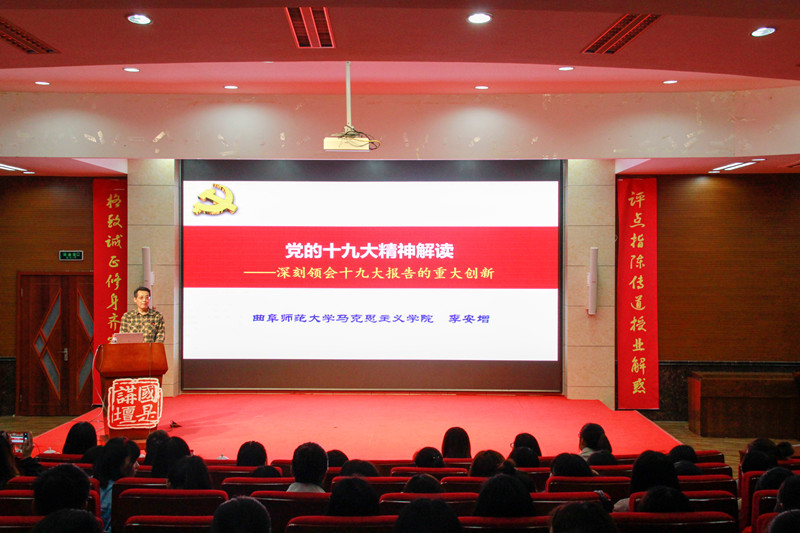 3月31日,由党校、宣传部、学工部(处)、教务处、团委主办,马克思主义学院承办,学生社团星火学社协办的“国是讲坛”第十九讲开讲。本次讲座的主题为“深刻领会十九大报告的重大创新”,由目前全省唯一的马克思主义理论学科泰山学者、曲阜师范大学马克思主义学院院长、博士生导师李安增教授主讲,马克思主义学院院长刘振光教授辅讲。党委宣传部部长兼教师工作部部长孔嵩峰、部分教师、全校学生党员和学生入党积极分子及思想政治教育专业全体学生近400人聆听了讲座。