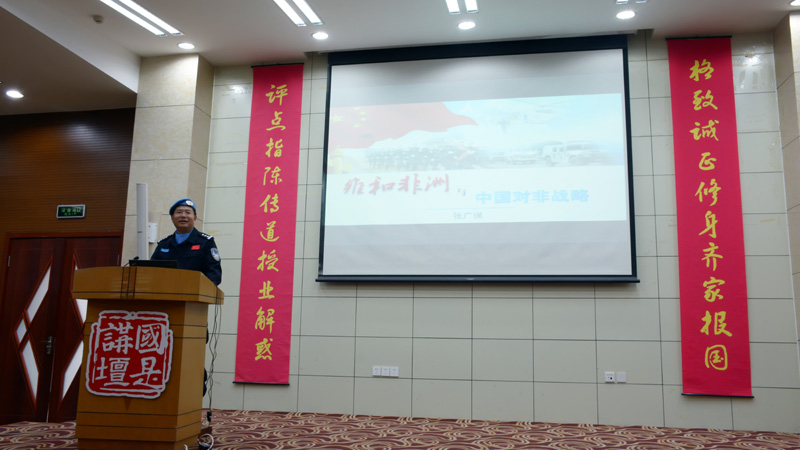 随后,张警官就“维和非洲与中国对非战略”这一主题,结合自己的亲身经历,饱含真情,慷慨陈词,就“中国第三支赴利比里亚维和警察防暴队工作情况” 、“参加维和的工作几点体会”和“关于对我国对非战略的几点理解”等三个方面的问题展开了详尽阐述。他指出,防暴队的日常工作主要包括固定哨位值守、日常巡逻、联合巡逻、要人警卫、联合国物资押运、人群骚乱处置和重大节日安保等七个方面。在一年的时间里,大家抱定为国牺牲的精神,牢记重托,不辱使命,冒着肆虐的疫情甚至枪林弹雨,圆满完成了工作任务,取得了维护利比里亚和平稳定、促进中国与利比利亚友好交往、扩大中国在联合国影响、保护中国海外利益和锻炼了队伍等五个方面的成绩。张警官在谈到自己参加维和工作的体会时,明确指出,海外斗争无处不在,中国维和势不可挡,中国维和的层次正在提高。最后,他指出,从一定意义上讲21世纪是非洲的世纪,非洲有着广阔的发展前景,同时又受多方面因素影响,中国对非洲的传统优势受到了挑战。因此,他认为,应该从多方面充实中国对非战略,即“关键是做好人的工作”、“在经济上大力投资非洲”、“大量输出软实力”、“以军事作后盾保护中国在非洲的利益”、“大力推行公共外交”、“设立半民间半官方的专门机构,保护中国在海外的利益”、“用非洲人来做非洲的事,用非洲人的方法来解决非洲的问题”、“统一思想、协调国内各部门利益,整合对非资源,最大限度的维护我们的国家利益”。