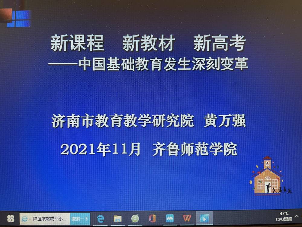 为进一步加强我校师资队伍建设,构建灵活的人才培养体系,促进教师的迅速成长,培养具有优良师德、先进理念的教师队伍;积极对接基础教育一线,加大对学生的培养力度,教务处近期下发了关于加强利用“名师名校长工作站”培训的通知。11月18日马克思主义学院邀请了齐鲁名师、全国基础教育教学专家、济南市教育教学研究院教研员黄万强老师为马院师生作题为《新课程 新教材 新高考——中国基础教育发生深刻变革》的学术报告。马院全体师生近300人通过腾讯会议线上聆听专家报告并进行了研讨。