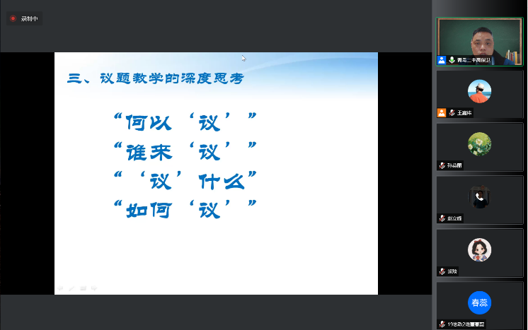 5月9日,马克思主义学院在腾讯会议线上举办“青马论坛”第十五期学术沙龙活动,特邀齐鲁名师、特级教师、全国优质课一等奖获得者、青岛二中政治学科发展研究室高保卫老师为马院师生作题为《“议题教学”的行与思》的学术报告。本场论坛由马克思主义学院副院长刘金玲教授主持,马院全体师生近300人在线聆听专家报告并进行了研讨。
