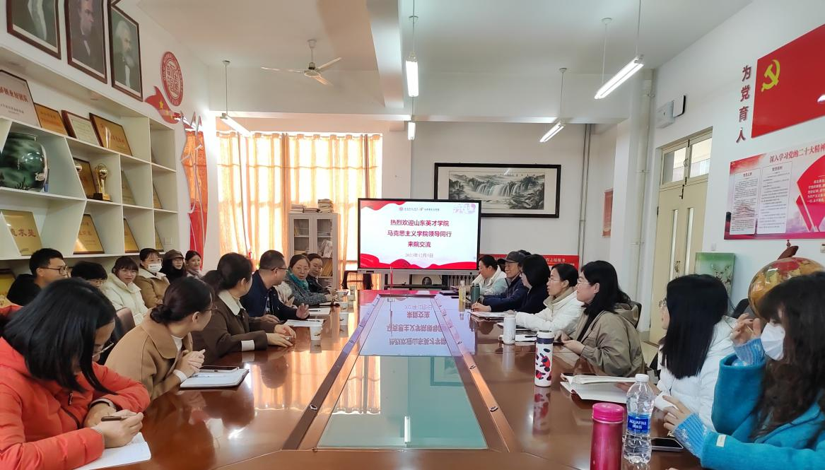 为增进高校之间交流学习,提升青年思政课教师教学科研能力水平,2023年12月5日,山东英才学院马克思主义学院一行20人前来我院交流,我院“德法”教研室和“纲要”课教研室全体教师参加。会议由副院长刘金玲教授主持。