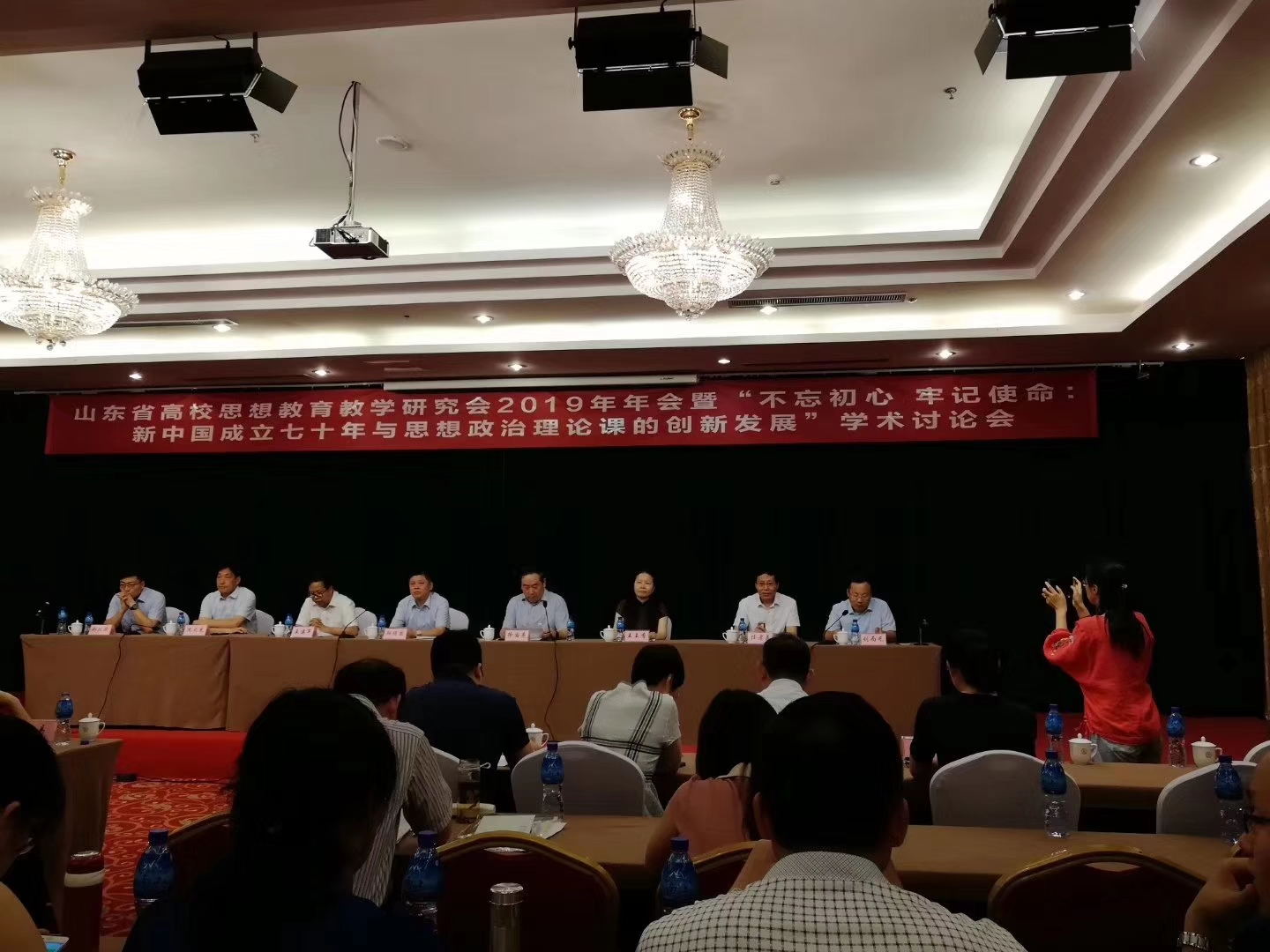 7月27-28日由山东省高校思想教育教学研究会、山东大学马克思主义学院、山东青年政治学院联合举办的山东省高校思想教育教学研究会2019年年会暨“不忘初心 牢记使命:新中国成立七十年与思想政治理论课的创新发展”学术讨论会在烟台龙口市东海月亮湾海景酒店举办。《马克思主义研究》研究员、编辑部副主编汪世锦,《马克思主义理论学科研究》编辑部主任蒋旭东,《红旗文稿》杂志社社长顾保国,中国人民大学王易教授,中国社会科学院刘志明研究员,四川大学原祖杰教授,《学校党建和思想教育》张永平主编,北方工业大学李志强教授,同济大学徐蓉教授,武汉大学倪素香教授,《光明日报》总编室副主任李亚彬,《山东社会科学》编审刘要停,北京科技大学讲师、《思想教育研究》责编许慎分别作了报告,来自山东省各高校的120余位教师参加了研讨会。我院派出青年教师汪秀刚参加了此次会议并参与了互动研讨,汪秀刚老师与《红旗文稿》杂志社顾保国社长就“中国如何在国际上加强自己的话语权”问题进行了交流讨论。
