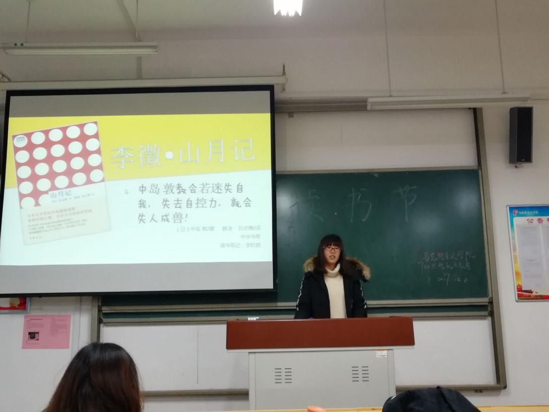 本次活动以宿舍为单位分八个小组来开展。活动开始前,各个小组选定了一本书籍进行小组内的阅读、分享和讨论。活动开始后,各个小组的代表依次上台与大家进行交流。有的同学阅读的书籍是简的《傲慢与偏见》,作品以男女主人公达西和伊丽莎白由于傲慢与偏见而产生的爱情纠葛为主线,共写四起姻缘;有的同学与大家分享的书籍是《白夜行》,作者东野圭吾将无望却坚守的凄凉爱情和执著而缜密的冷静推理完美结合,大量运用反讽的手法即让读者感到出其不意又引人深思;有的同学向同学们推荐的书籍是《简▪爱》,小说引人入胜的展示了男女主人公曲折起伏的爱情经历,歌颂了敢于摆脱旧习俗的偏见,勇于反抗争取自由与平等的妇女。其他小组的同学也通过不同的方式与大家分享了许多优秀的书籍。