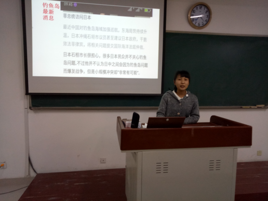 活动开始,由每个小组的代表上台就近期发生的时政热点进行讲评。在本次讲评中比较热点的一个话题就是近来议论声比较大的“韩国总统朴槿惠闺蜜干政”事件。讲述同学认为此事件是导致朴槿惠的支持率首次成为个位数的重要原因,与此同时也加重了韩国的经济困难;“美国重返亚太的战略”一事也引起了比较大的关注,同学们认识到随着中国的实力不断增强,对美国的地位造成了一定的威胁,关于此战略是美国意图在中国的周围投种子,以遏制中国快速发展......之后,其他小组亦针对最近时事进行了讲解,引导同学们加深了对时事的关注和了解。