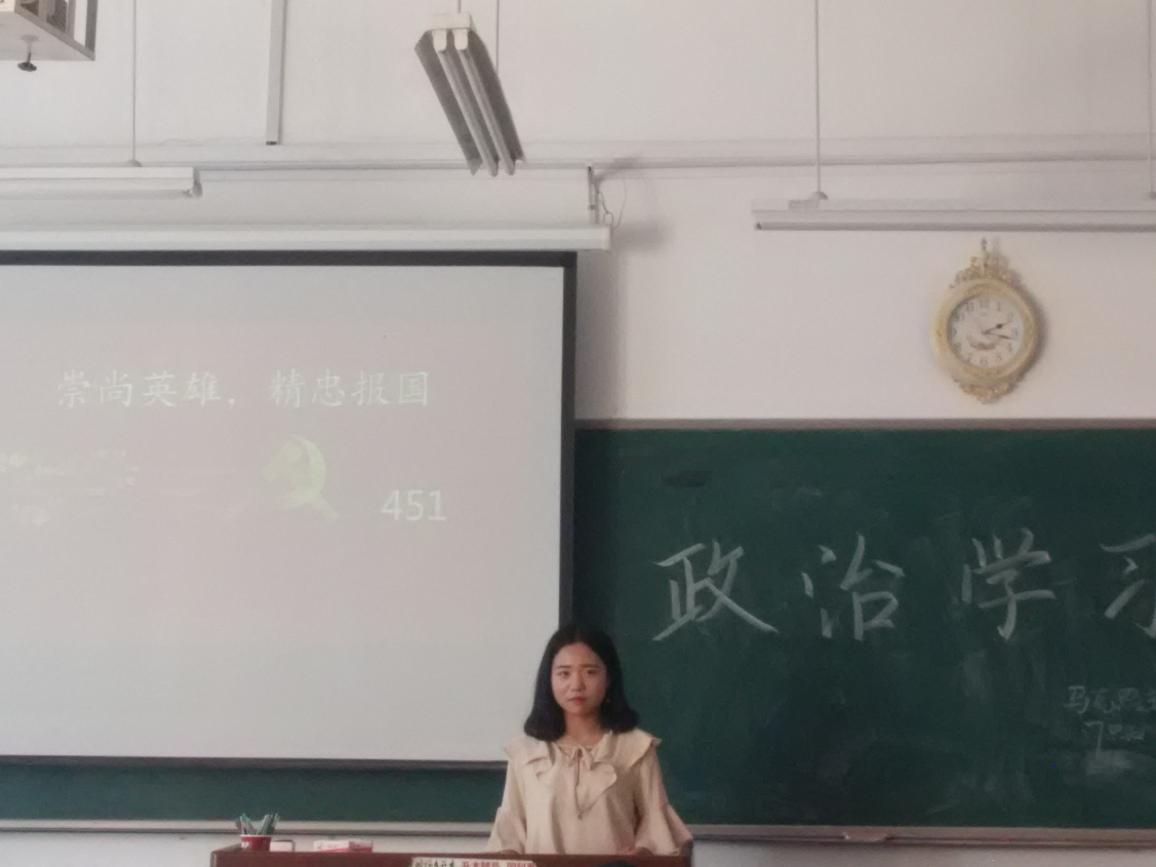 王莹同学围绕“崇尚英雄,精忠报国”这一主题,讲述了抗美援朝战争中,黄继光舍身堵枪眼的英雄壮举,黄继光奋不顾身的英雄气概为人们所敬仰;岳飞“精忠报国”,奔赴前线,英勇杀敌,立下赫赫战功,成为抗金名将……他们的英雄事迹成为人们学习的楷模,激励和教育了几代人。在本次政治学习中,同学们通过学习英雄精神,深刻地认识到英雄烈士的事迹和精神是中华民族共同的历史记忆和宝贵的精神财富,并且认识到贯彻落实党的十九大精神,就要坚持捍卫英雄烈士的鲜明价值导向,传承弘扬英雄烈士精神,培育和践行社会主义核心价值观,激发实现中华民族伟大复兴的强大精神力量,为实现社会主义现代化而努力。