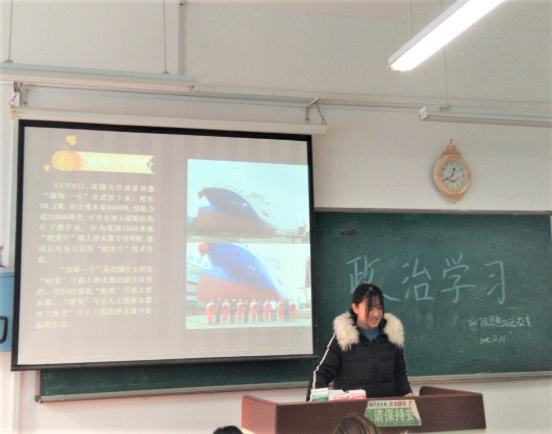 12月8日,我国自主研发的第一艘载人潜水器支持母船,大洋调查利器“深海一号”在武汉下水。2018年12月11日,马克思主义学院2017级思想政治教育本科班全体在校生在2号教学楼A311教室举行了政治学习,从潜水器研发中学习维护海洋权益的意义。