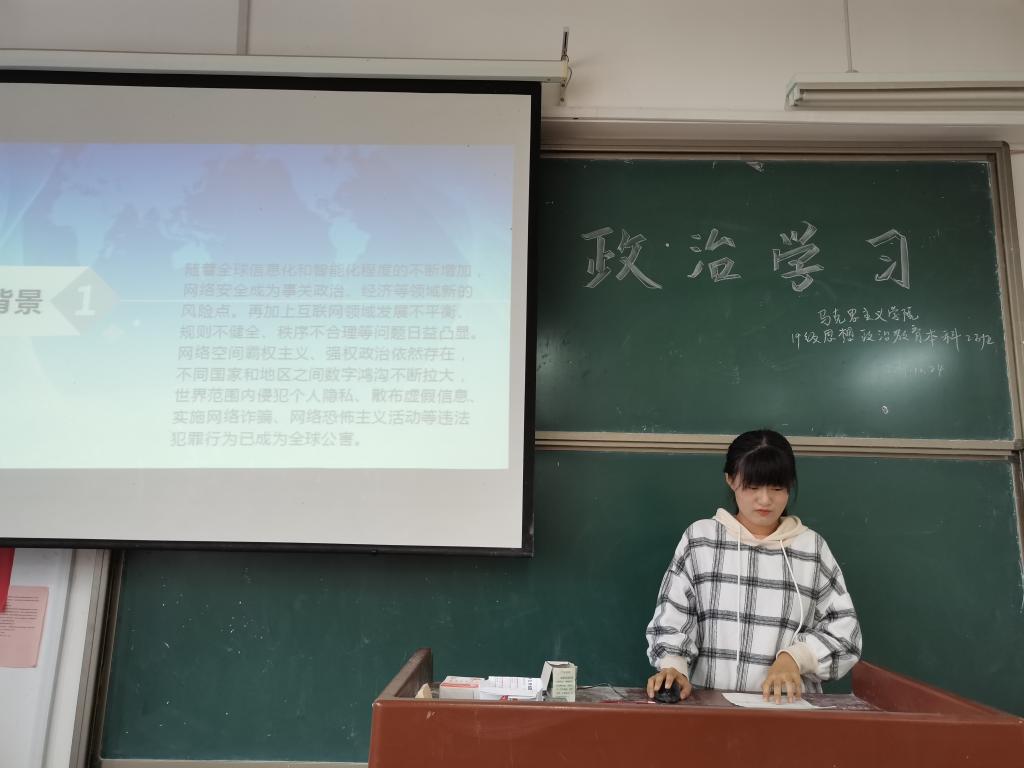 为提高同学们对网络空间的了解,丰富同学们的网络知识,我院2019级思想政治教育专业全体同学于2019年10月20日在二号教学楼a310教室举行了以“构建网络空间命运共同体”为主题的政治学习活动。