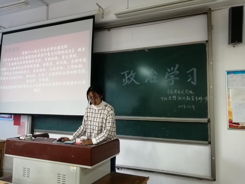 为回顾改革伟大历程,了解外部环境的深刻变化和我国改革面临的新情况、新问题、新挑战,坚定全面深化改革的决心,2019年10月31日,2018级、2019级思想政治教育专业全体同学在一号教学楼A31教室举办了以“举旗定向 谋篇布局 改革全面发力”为主题的政治学习活动。