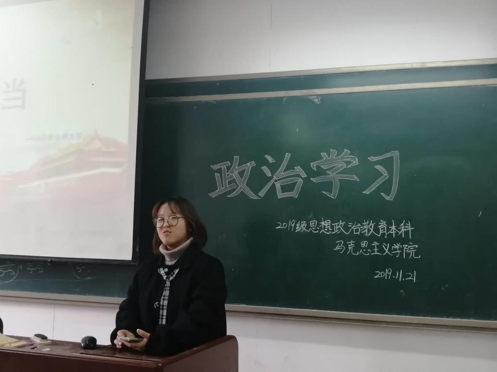 为提高同学们的民族自尊心与自信心,感受伟大祖国日新月异的发展,2019年11月21日,我院举办以“中国担当”为主题的政治学习活动,本次活动由2018、2019级思想政治教育专业全体同学参加。