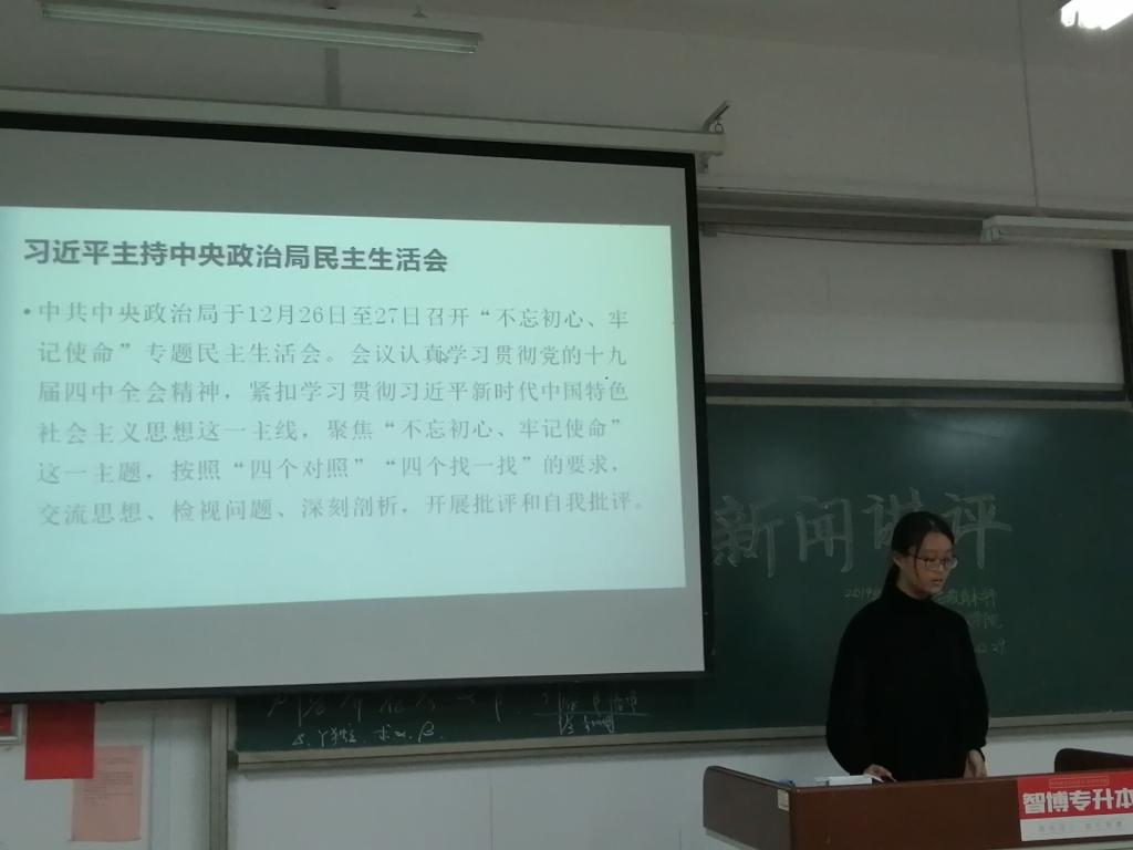 为了提高同学们对时政新闻的关注度、培养关注了解时政新闻的习惯和提升思政专业的能力素养,我院于12月29号在二教A310举行了新闻讲评活动,本次活动由思想政治教育专业2018级、2019级全体同学参加。