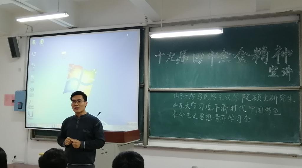为深入学习贯彻党的十九届四中全会精神,适时做好大学生思想政治教育工作,提高同学们的政治素养并积极为我校马克思主义学院学生考研“支招”,1月7日下午,我校马克思主义学院特邀山东大学马克思主义学院硕士研究生、山东大学习近平新时代中国特色社会主义思想青年学习会胡海鹏为代表的7名同学到我院进行党的十九届四中全会精神宣讲活动,宣讲于我校章丘校区二号教学楼A102举行。我校马克思主义学院党总支副书记赵立峰副教授,2017、2019级思想政治教育专业全体本科同学近130人到场聆听。