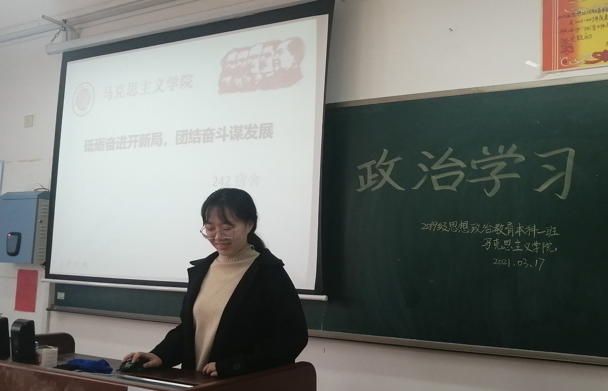 2021年的春天,“两个一百年”奋斗目标在此时交汇,十三届全国人大四次会议和全国政协十三届四次会议在万众瞩目中胜利召开。为学习全国两会核心内容、把握两会核心精神、增强思政学子的专业素养,2021年3月18日,我院于2号教学楼A310教室举办了主题为“砥砺奋进开新局,团结奋进谋发展”的政治学习活动。参加此次活动的有马克思主义学院2018、2019以及2020级思想政治教育本科班全体同学。
