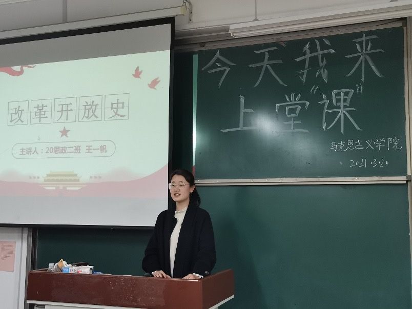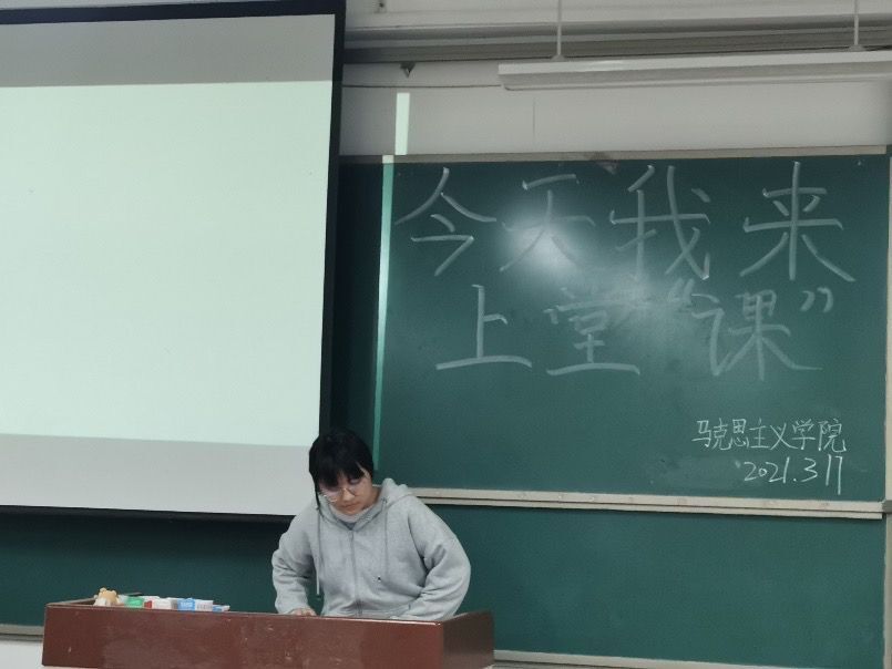 为提升我院2020级学生思想政治教育示范,锻炼学生的备课、语言表达、板书等教师必备技能,2021年3月15日至20日,我院于2号教学楼A310教室举办了《今天我来上堂“课”》活动。参加此次活动的有马克思主义学院2020级思想政治教育本科班全体同学和2019级部分学生。