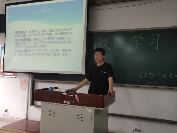 为使同学们深入学习“上海精神”,全面了解上海合作组织在当今时代所发挥的作用,2021年6月10日,我院于2号教学楼A310教室举办了以“秉持上海精神,深化互利合作”为主题的政治学习活动,参加此次活动的有马克思主义学院2018、2019、2020级思想政治教育专业本科全体同学。
