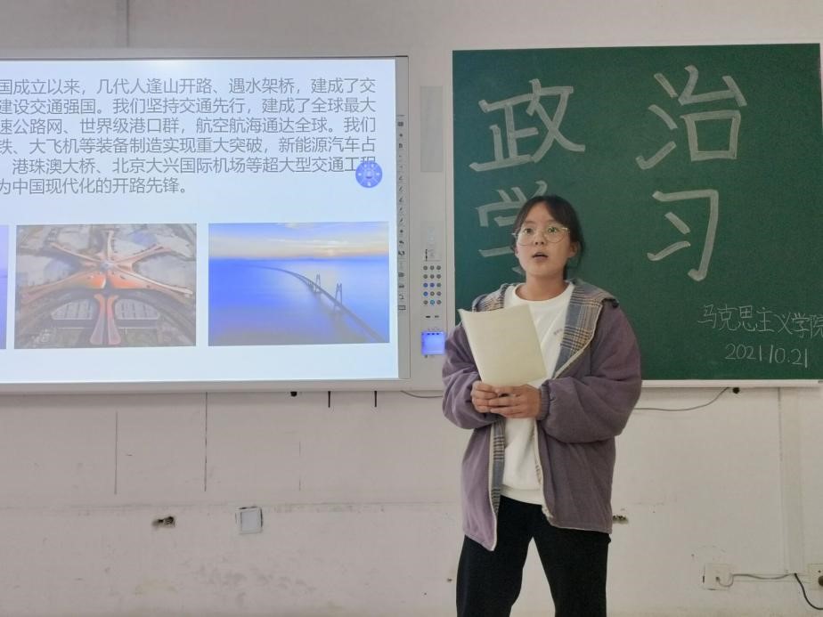 在本次政治学习活动中,吕奕菲同学首先强调交通已成为中国现代化的开路先锋,是中国打赢脱贫攻坚战的助推剂,使同学们明晰交通对于大国建设的先行作用。随后,她从修路致富典型事例、道路交通在减贫脱贫的重要作用和交通脱贫攻坚启示三方面展示中国修路致富的光辉历程。最后,她提醒同学们要时常关注时政热点,牢记党的历史经验,发扬党的优良传统,不断拓宽视野增长见识,为巩固脱贫攻坚成果贡献青春力量。郭淑萌同学通过分析多重数据展现中国脱贫攻坚战对于世界脱贫事业的卓越贡献,坚定了同学们的政治自信。“新中国成立以来,几代人逢山开路、遇水架桥,建成了交通大国,正在加快建设交通强国”,她引用习近平主席在第二届联合国全球可持续交通大会上的讲话,突出交通事业的发展对于全面建设社会主义现代化国家的重要影响。她指出,交通事业的发展不仅对于我国的脱贫攻坚事业起到推动作用,还为构建人类命运共同体增光添彩,展现出了大国担当。在本活动的最后,两位同学分别进行了防疫宣讲,她们通过展示顺口溜、漫画等新形式,提醒同学们防疫工作任重道远,科学防治人人有责。