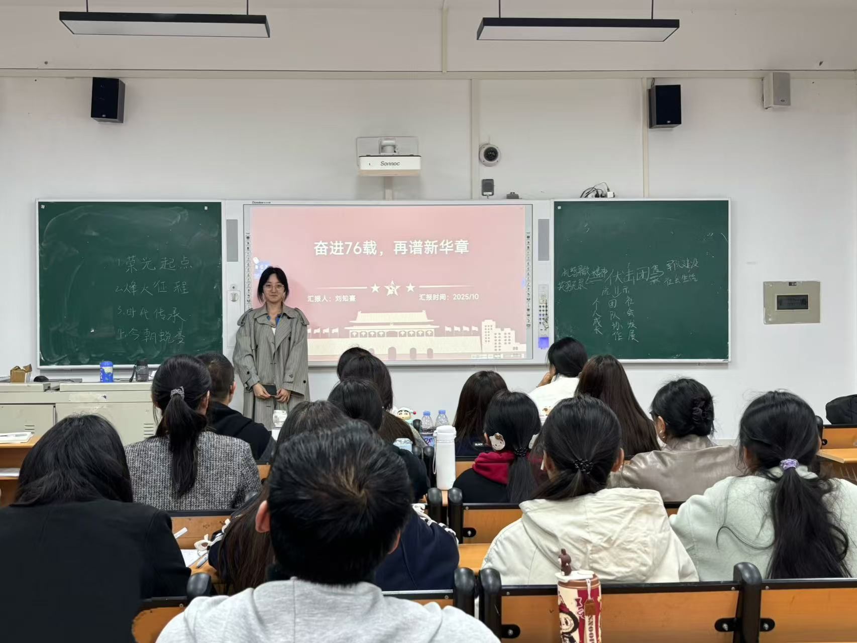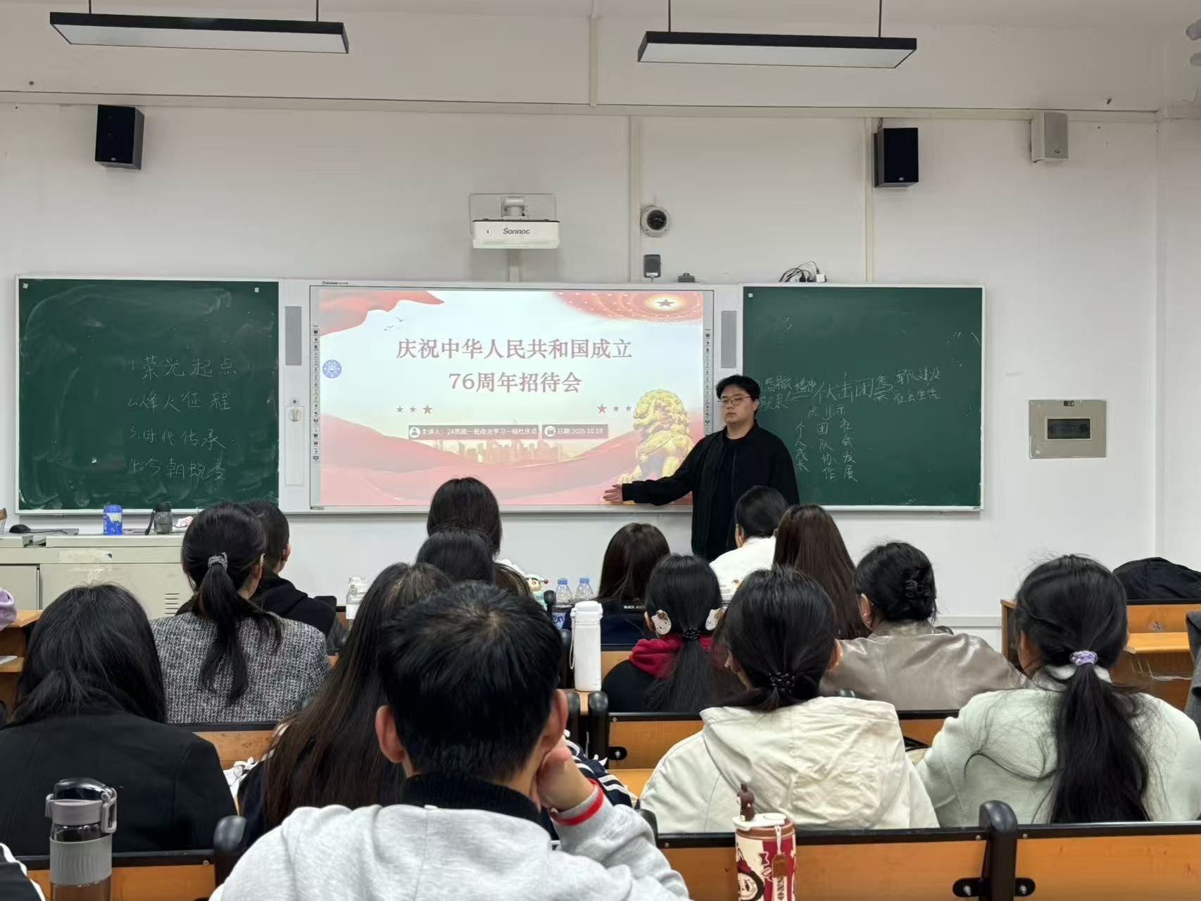 本次政治学习以习近平总书记在庆祝中华人民共和国成立76周年招待会上的重要讲话为主要内容,刘知熹、杜庆贞、荆茂坤等五位同学围绕“建功新时代”、“奋进赶考路”和“扬帆新征程”三个方面展开讲解。各位主讲人带领大家深入回顾新中国成立76年来,党领导人民自力更生、接续奋斗所取得的辉煌成就,勉励同学们勇于面对大量需要破解的矛盾问题,始终保持一往无前的奋斗姿态,发扬越挫越勇的斗争精神,做到难不住、压不垮,兢兢业业、锐意进取,全力战胜各种困难和挑战,从而夺取新的伟大胜利。