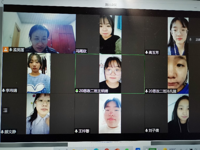 为增强同学们的安全意识,关注同学们的心理健康状况,了解同学们的学习情况,2021年10月,我院2020级思想政治教育本科二班班主任通过腾讯会议与同学们开展了“温暖进宿舍”活动。参加此次活动的有孟英莲老师和2020级思想政治教育本科二班全体同学。