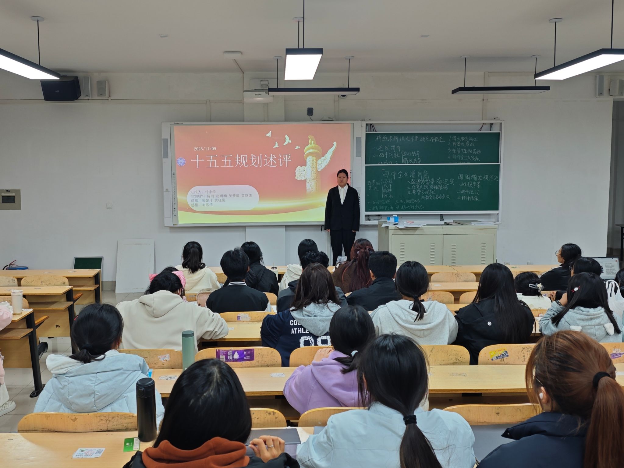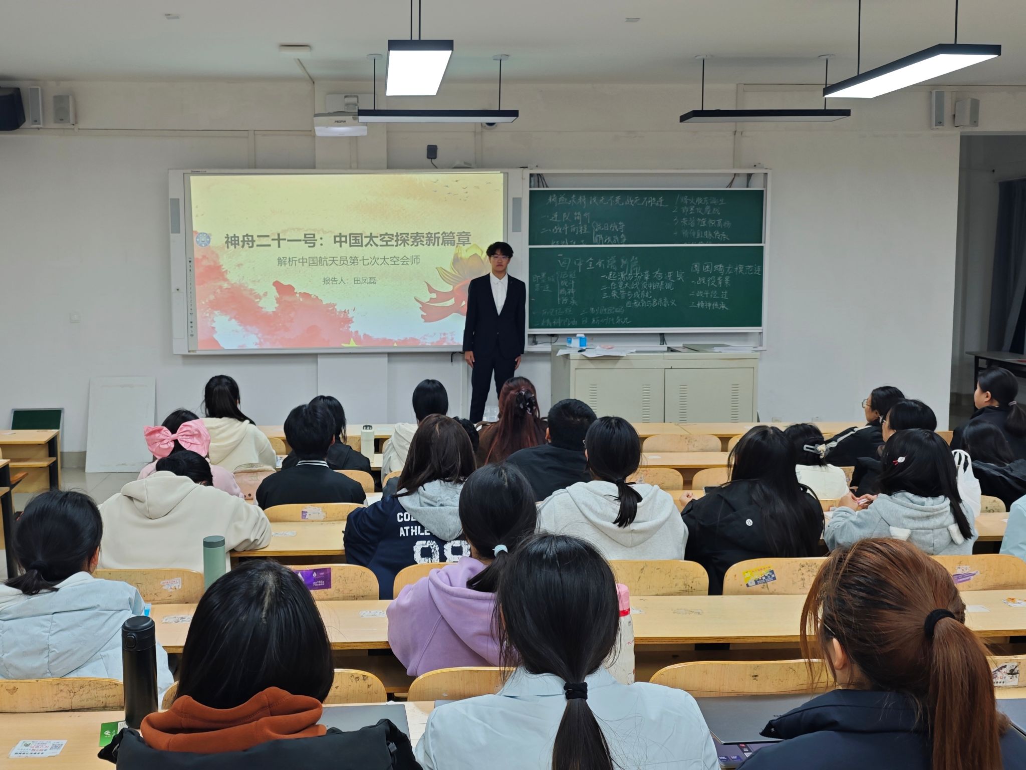 本次时政述评以近期发生的时政热点为主要内容,丁雨轩、公俐、蔡艳秋等八位同学担任主讲人。丁雨轩同学聚焦11月2日“全球视野下的中国抗战”国际学术研讨会在京开幕这一新闻进行了分享,带领同学们围绕中国抗战的世界意义、战时国际合作、抗战与台湾光复、台湾的抗日运动等议题进行研讨;亓志莹同学介绍了11月1日神舟二十一号航天员乘组顺利进驻“天宫”、中国航天员完成第7次“太空会师”这一新闻;陶胜分围绕第八届中国国际进口博览会于11月5日至10日在上海举办展开讲解,让大家看到了中国超大规模市场的蓬勃生机和活力;杜庆贞同学讲解了习近平将赴韩国出席亚太经合组织第三十二次领导人非正式会议并对韩国进行国事访问这一新闻。