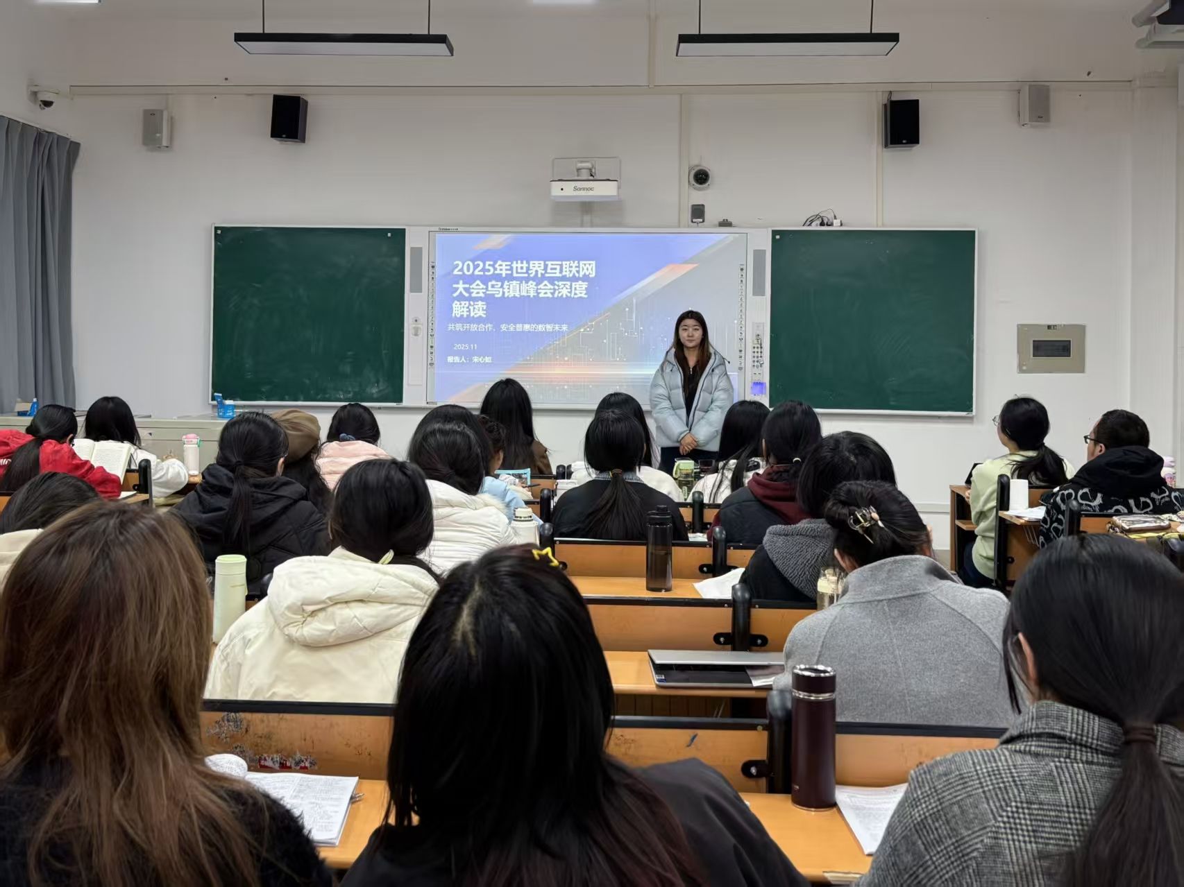 本次时政述评以近期发生的时政热点为主要内容,宋心如、孙雨璇、李晨溪等11位同学担任主讲人。宋心如同学聚焦于11月7日2025年世界互联网大会乌镇峰会开幕的新闻进行了精彩发言,让同学们了解到构建网络空间命运共同体的倡议,正从中国方案发展为国际共识、从理念愿景转化为实践成果;孙雨璇同学分享了10月13日中国建筑助力建设中国核聚变装置BEST项目的时政新闻,让大家直观感受我国前沿科技领域的突破与担当;李晨溪同学围绕11月9日第十五届全国运动会在广东省广州市开幕展开讲解;崔玉树同学介绍了11月11日人民空军成立76年这一新闻热点,使同学们深刻认识到祖国的强大,离不开一代代青年人的拼搏进取。此外,肖林颖、朱文晴、刘娇等同学也就不同的时政热点进行述评。