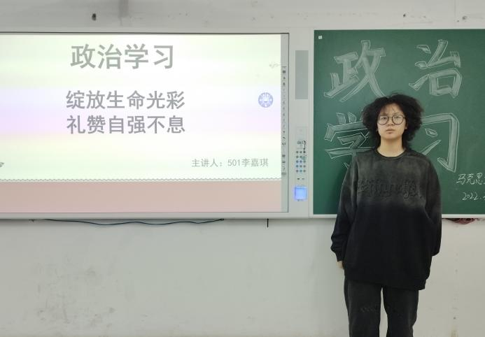 本次活动由李嘉琪和王子骏同学作为主讲人。李嘉琪同学首先讲述到,我国残奥会运动员一旦站上起点就发挥出毫不退缩,不向命运低头,勇于挑战,勇于拼搏的精神;他们踏上冰雪赛场,便加速冲刺,全力以赴,为努力拼搏的旅程写下无悔篇章,更是向世界展示中国人独有的爱国情怀。其次,她详细介绍了火炬手李端,李端曾是职业篮球运动员,因一次过期灭火器爆炸导致他双目失明,右手食指第一节缺失。即使生活多么摧折,他依旧不放弃对生活的希望,再次重启了自己的运动生涯。通过他的事迹,同学们获得了精神力量,希望他们在以后的学习生活中勇敢克服困难,持之以恒直至成功。王子骏同学介绍了在北京冬残奥会上夺得首枚金牌的中国男运动员刘子旭,这枚金牌是中国残疾人选手获得的冬残奥会首枚雪上项目金牌和首枚个人项目金牌。这枚金牌不论是对于刘子旭个人还是中国来讲都是一个巨大的荣耀,让守在电视机前观看比赛直播的人们也纷纷为之激动,人类的坚强、勇敢、自强不息、拼搏的精神在这些运动健儿们的身上体现的淋漓尽致,奥运健儿为新中国的未来又一次增添了光彩。最后,两位同学针对最近严峻的疫情形势进行了防疫宣讲,提醒同学们加强自我体温检测,如有不适尽快就医。