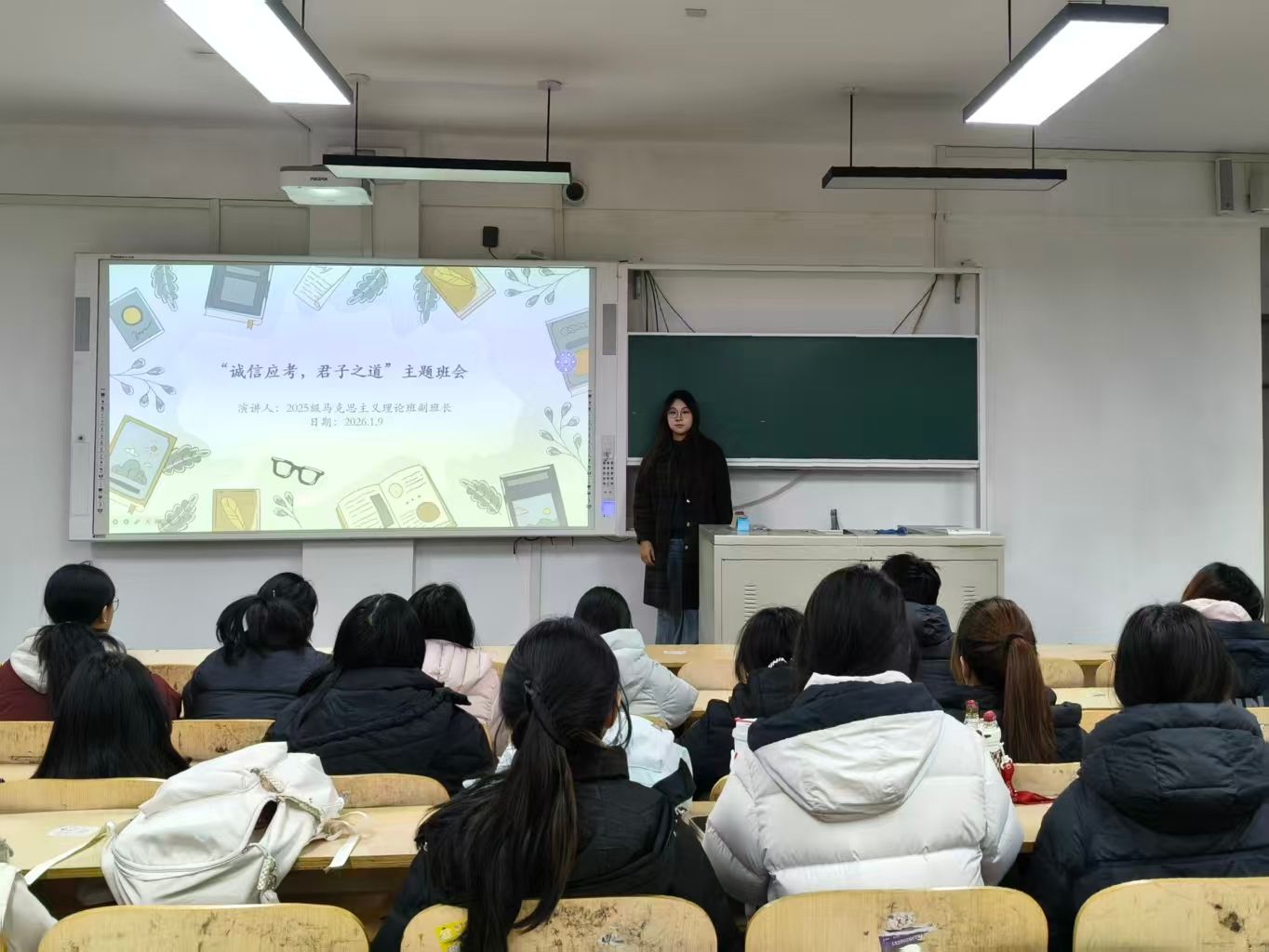 为深化新时代诚信教育内涵,强化学生的诚信应考意识,共建公平有序的考试环境,2026年1月7日至9日,马克思主义学院在2号教学楼A317、A310、A202教室召开诚信考试主题班会。马克思主义学院2024级、2025级全体同学参加会议,由各班副班长主持。