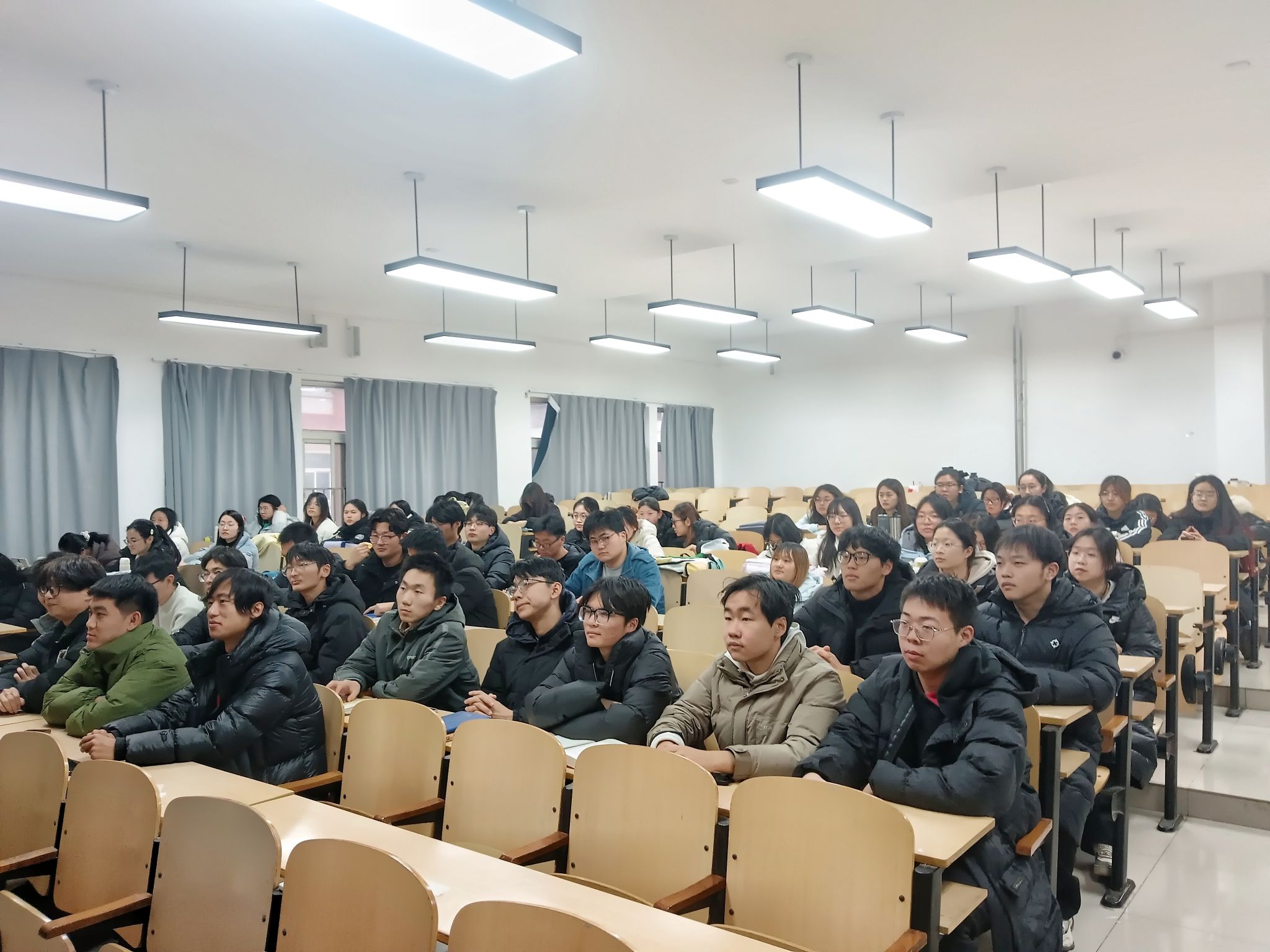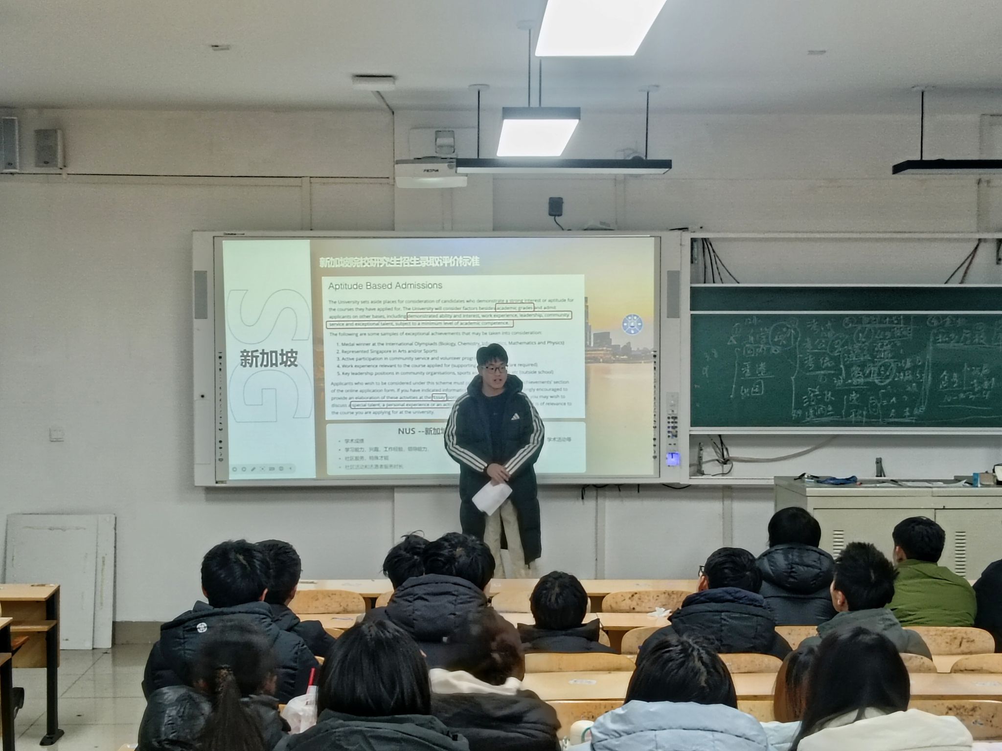 随后,2022级学长刘文旭结合自身出国留学申请经历,分享了宝贵实战经验。他首先纠正了“出国读研即镀金”的认知误区,着重强调国外院校在英语能力、专业课成绩等方面的严格要求,引导同学们树立理性留学观念。针对出国留学筹备工作,他详细拆解申请全流程时间线,逐一明确关键节点与核心任务,为有留学意向的同学提供了可落地的行动指南。同时,他结合自身思考,客观分析了出国留学的优势与挑战,着重提醒同学们要立足自身实际情况,理性研判、科学抉择,找准契合自身发展的职业规划道路。