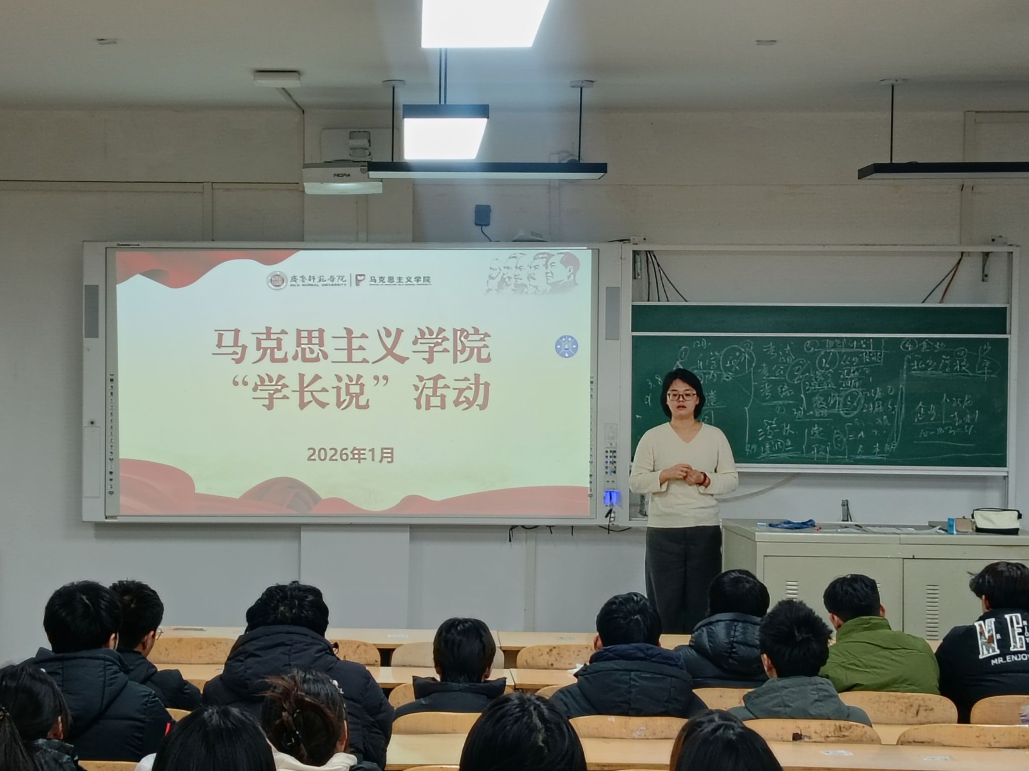 为帮助青年学子厘清升学就业发展脉络,搭建朋辈互助、经验传承的优质成长平台,2026年1月14日,马克思主义学院在2号教学楼A207教室成功举办“学长说”系列活动之职业规划经验交流会。活动特邀学院2026届毕业生刘文旭,为2023级全体同学专题分享出国留学申请相关经验,学院团总支书记王雅文主持本次活动。