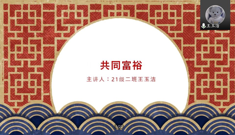 本周《今天我来上堂“课”》活动主要围绕贯彻新发展理念、走好共同富裕之路等与本专业相关的知识展开。首先,任赛楠同学以播放视频的形式向同学们详细介绍了“新发展理念”。她指出,在新发展阶段,我国需要深入贯彻创新、协调、绿色、开放和共享的新发展理念,在推进高质量发展中促进人的全面发展和社会的全面进步。与此同时,她向同学们强调,新发展格局决不是封闭的国内循环,而是开放的国内国际双循环,是在掌握发展主动权的基础上与全球各国共同建设和维护市场成长机会的共享式发展格局。随后,王玉洁同学讲解了共同富裕的基本含义、实现途径以及我国为实现共同富裕所进行的实践探索。“共同富裕是社会主义的本质要求,是中国式现代化的重要特征”,她引用习近平总书记的话语向同学们阐述了共同富裕的重要意义,这一论述也向世界宣示:中国将要实现的现代化是人类社会有史以来人口规模最为巨大的现代化,是发展成果惠及广大人民群众的现代化,是实现全体人民共同富裕的现代化。最后,她启示同学们:作为一名大学生,我们要加强对党的路线方针决策等知识的了解,在行动上自觉向党组织靠拢,保持思想与行动的高度统一。2020级学生担任打分人,依据教师基本素质、语言表达能力、课件制作等对主讲同学的讲课进行打分,并进行点评,主讲同学在课后根据打分人的建议进行反思。