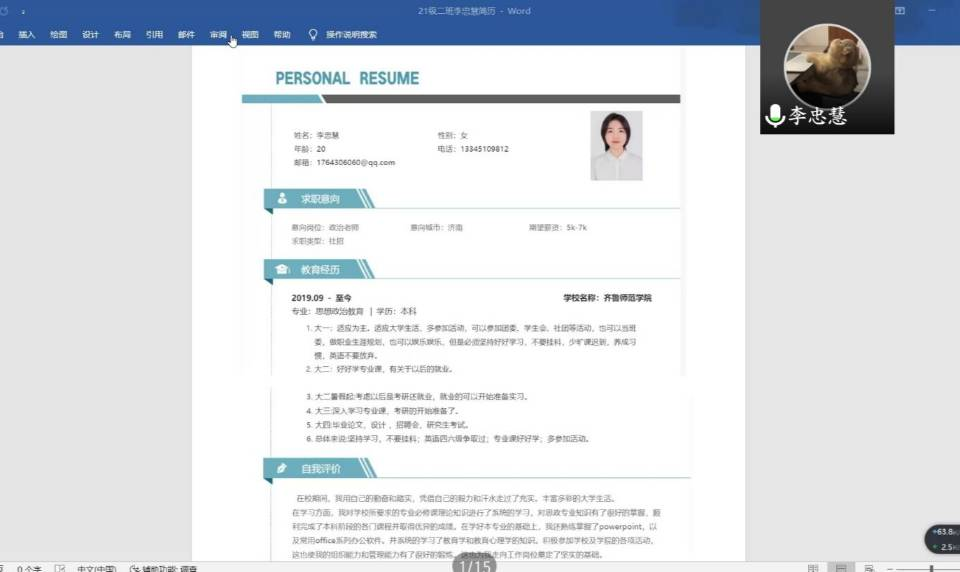 为帮助同学们具备基本就业知识,了解自己的职业追求和薪资期望,把握当前的努力方向和奋斗目标,2022年4月14日,我院学生通过线上的方式举办了简历设计大赛活动。参加此次活动的有马克思主义学院思想政治教育本科班全体同学。