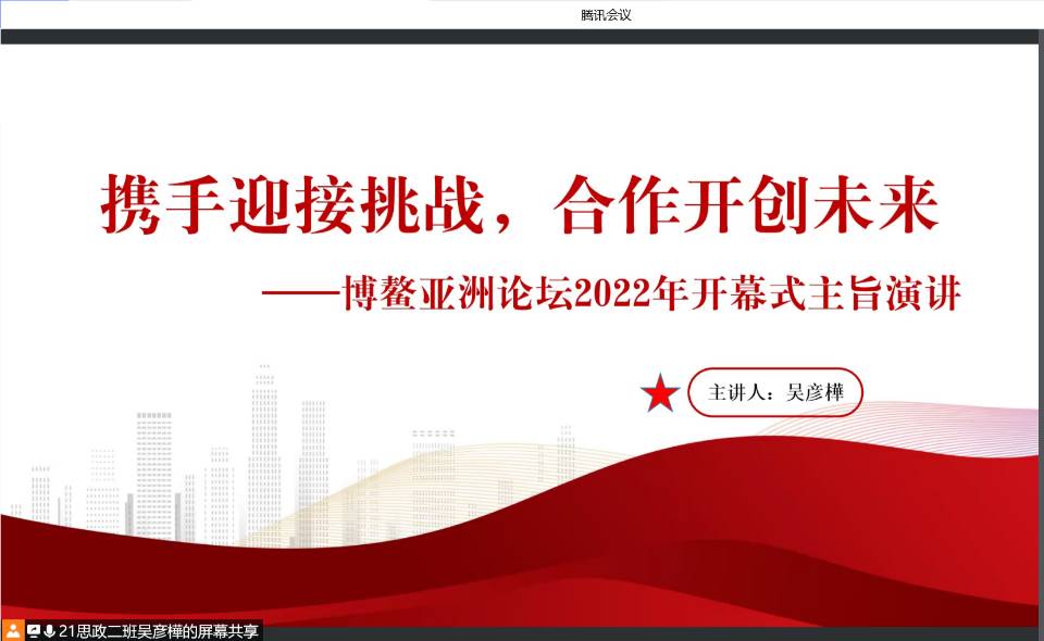 2022年4月20日至22日,博鳌亚洲论坛2022年年会在海南隆重举行。为引导同学们深入学习本次年会会议精神,把握时代脉搏,提升政治素养,2022年4月27日,我院通过线上的方式举办了以“携手迎接挑战,合作开创未来”为主题的团支部大会。参加本次活动的有2021级思想政治教育本科二班全体同学。