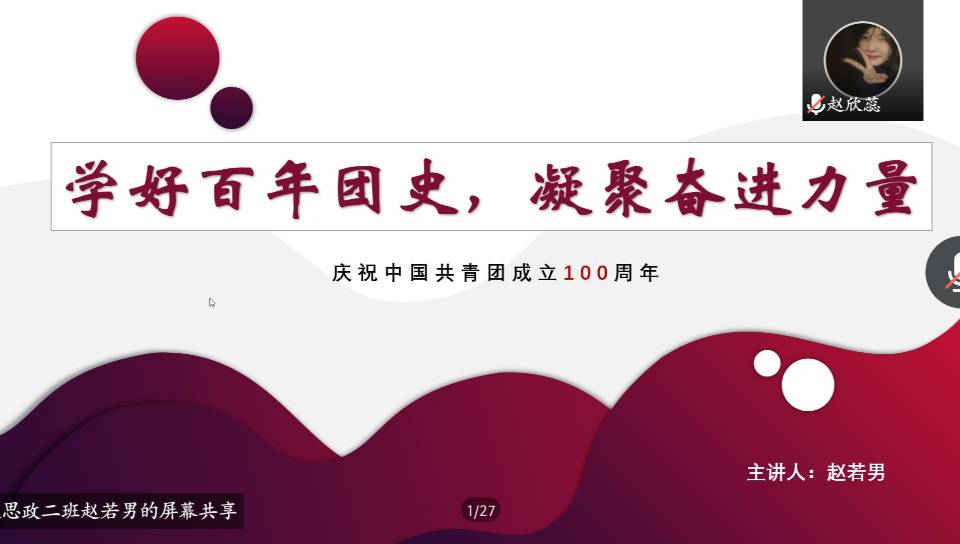 为纪念中国共青团建立100周年,重温共青团的光辉历史,增强同学们的团史学习意识,丰富同学们的团史知识,2022年5月2日至7日,我院学生通过线上的方式举办了《今天我来讲团史》活动。参加此次活动的有马克思主义学院2021级思想政治教育本科班全体同学和2020级部分同学。