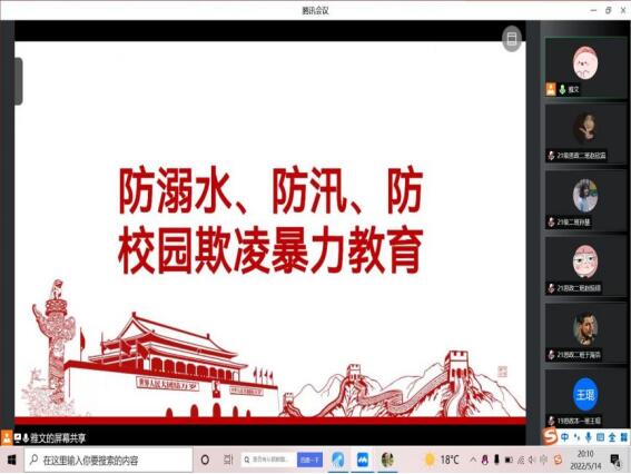 为进一步加强学生安全教育工作,2022年5月14日,我院于线上举行防溺水、防汛、防校园欺凌暴力教育相关的主题会议。参加本次会议的有马克思主义学院党委副书记毛雯老师、团总支副书记王雅文老师以及马克思主义学院全体学生。