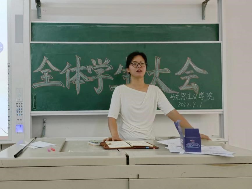 新学期,新起点,新征程,为做好新学期开学后学生思想政治教育和安全教育工作,马克思主义学院于2022年9月1日在二号教学楼A207教室开展“开学第一课”主题班会。参加此次会议的有马克思主义学院党委书记贾龙、党委副书记毛雯、团总支副书记王雅文以及马克思主义学院全体学生。