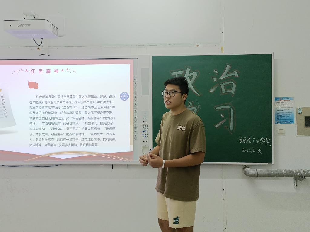 为进一步推动党史学习教育纵深发展,回顾和感悟中国共产党百年历程中产生和积淀的红色精神,激发同学们的爱国之心、强国之志和报国之行,2022年8月25日,马克思主义学院于2号教学楼A317教室举办了以“学习红色历史,传承红色基因”为主题的政治学习活动。参加此次活动的有马克思主义学院2019级、2020级和2021级思想政治教育本科班全体学生。