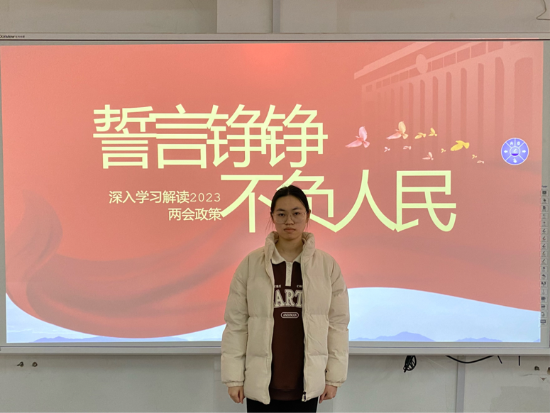 首先,闫晋同学聚焦于中华人民共和国第十四届全国人民代表大会,全面系统地向同学们讲述了会议的主要议程和选举意义,使同学们对于本次会议有了更加全面和细致的了解。随后,赵容容同学围绕全国两会的内容及意义展开论述,启示同学们志存高远、不负人民、忠于祖国。最后,贾瑶函同学以党的二十大报告中“新时代十年的伟大变革”为切入点,深入解析全国两会上提出的新时代取得的成就,启示同学们心系人民,做合格的新时代社会主义事业建设者。