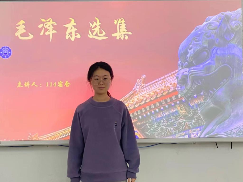 在本次读书节上,夏小惠、戚洪丽、王韵荻三位同学分别分享了自己的读书感悟。夏小惠同学分享了《毛泽东选集》一书中的《中国的红色政权为什么能够存在》一文,她向同学们介绍了该篇文章的写作背景及其内容,点明该文章是新民主主义革命理论的代表作之一,是马克思主义中国化的里程碑,鼓励同学们努力学习马克思主义中国化的理论知识。
