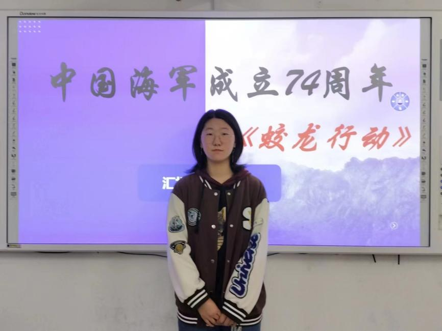 亮剑深蓝,强军强国。程莉同学聚焦中国海军成立74周年的相关内容,向同学们介绍了中国海军在现代化建设中取得的辉煌成就,并说明我国海军将在新征程上继续推进海军转型建设,以此加深了同学们对于国家海军事业发展的认识。