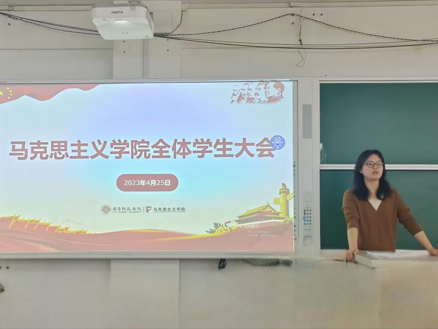 2023年4月25日,马克思主义学院在2号教学楼A207教室举行全体学生大会,参加本次会议的有马克思主义学院团总支副书记王雅文以及马克思主义学院全体学生。本次会议由王雅文书记主持开展。