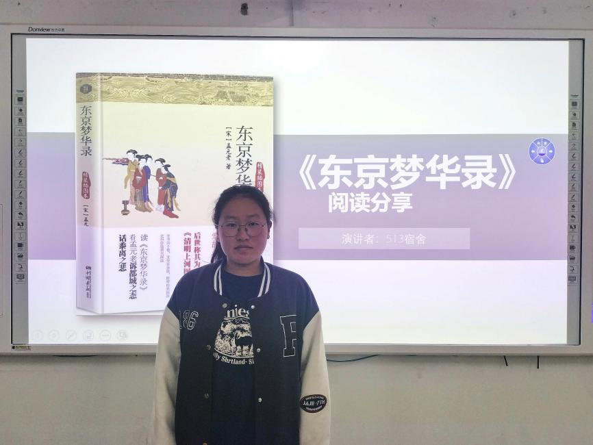 “箫鼓喧空,几家夜宴。”李婉晴同学推荐的书籍是《东京梦华录》。本书以徽宗政和、宣和年间汴京的汉族城市社会经济生活和文化生活为主要内容,描绘了这一历史时期市井街巷热闹的日常生活,她带领同学们从中领略了宋人的风土人情和东京城内富有生气和趣味的城市生活。