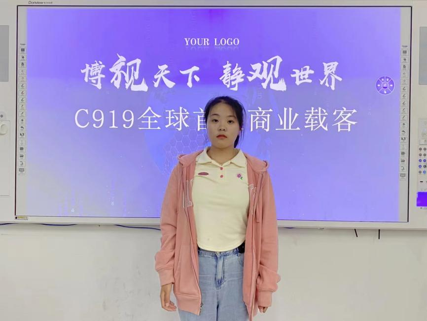 砥砺前行,逐梦蓝天。刘梦泽同学聚焦于C919全球首次商业载客飞行的相关内容,向同学们介绍了C919的发展历程,C919客机正式商用是中国航空制造业发展的重要历史节点,它向世界展示了中国大飞机参与全球竞争的信心与实力,加深了同学们对于中国航空制造业发展的认识。