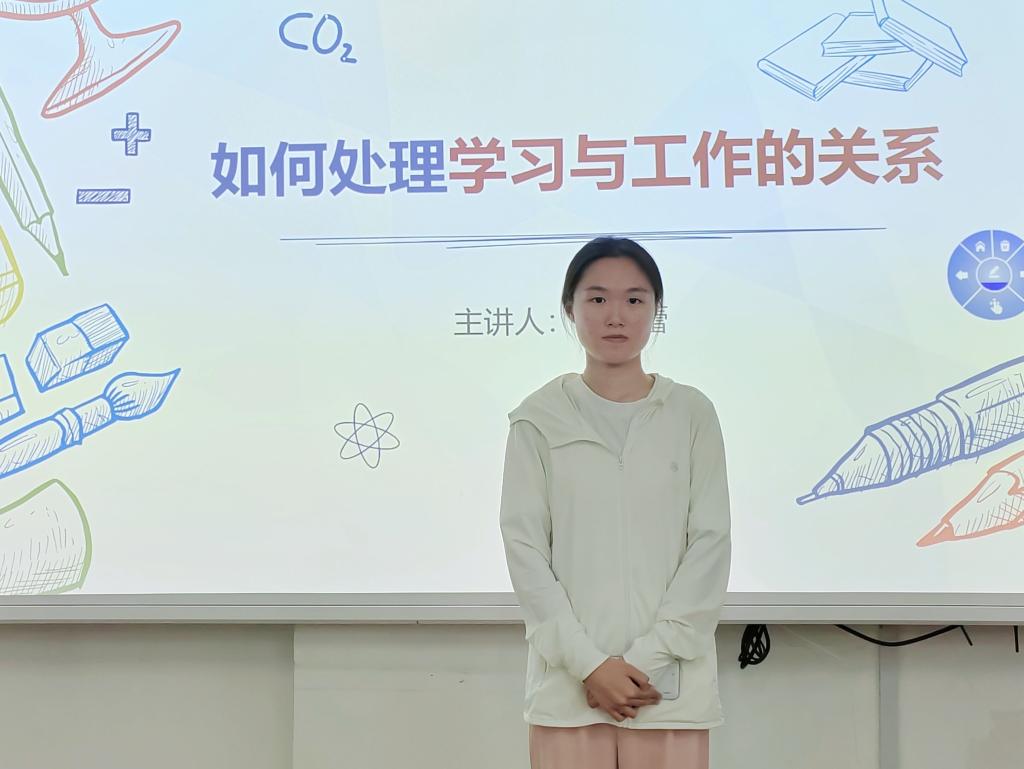 逄晓乐从培养积极心态的角度出发,结合曾经工作经历,建议学生干部在工作中抓主要矛盾,分清轻重缓急,同时要注意积累,打牢基础,利用碎片化时间,提升工作的效率与质量;随后,张彤蕾以“怎样平衡学习与工作的关系”为题,在夯实专业课知识与高效开展部门工作两方面传授了经验。