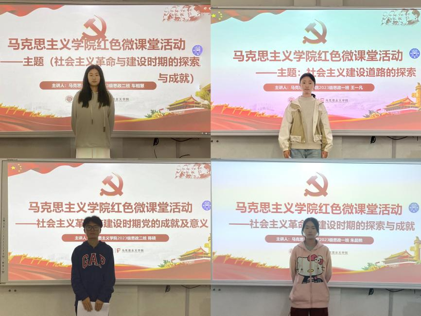 王一凡、朱鑫雨两位同学向同学们分享了中国共产党领导人民通过艰辛探索,实现了从一穷二白、人口众多的东方大国大步迈进社会主义社会的伟大飞跃,呼吁同学们要赓续爱国主义精神,坚定不移听党话、跟党走。