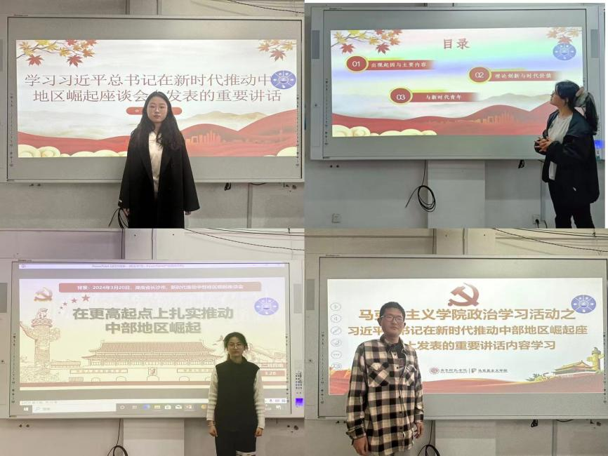 本次政治学习以2024年3月20日习近平在湖南省长沙市主持召开新时代推动中部地区崛起座谈会并发表重要讲话为主要内容。王姿蕲、党光磊、刘湘等六位同学为主讲人。