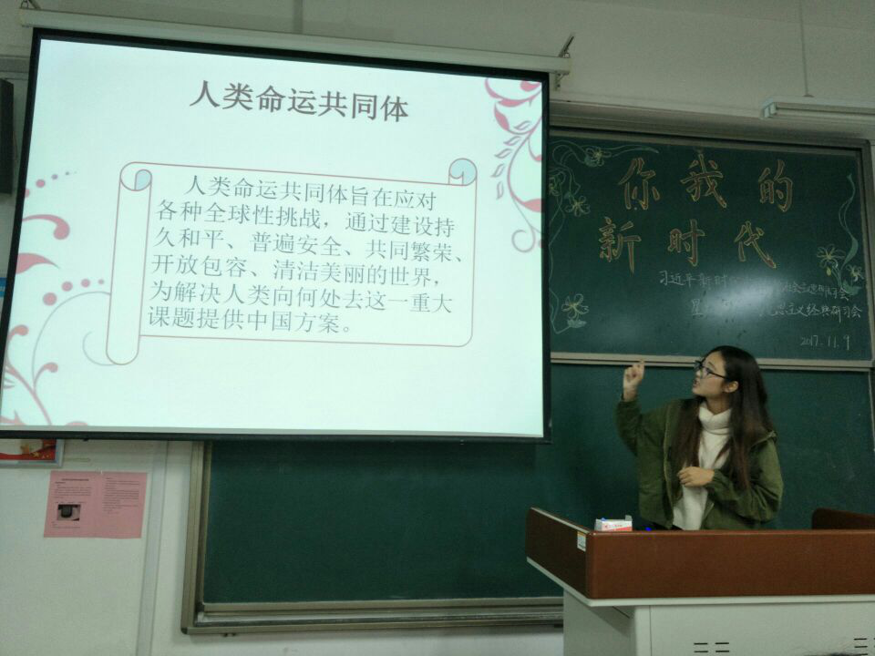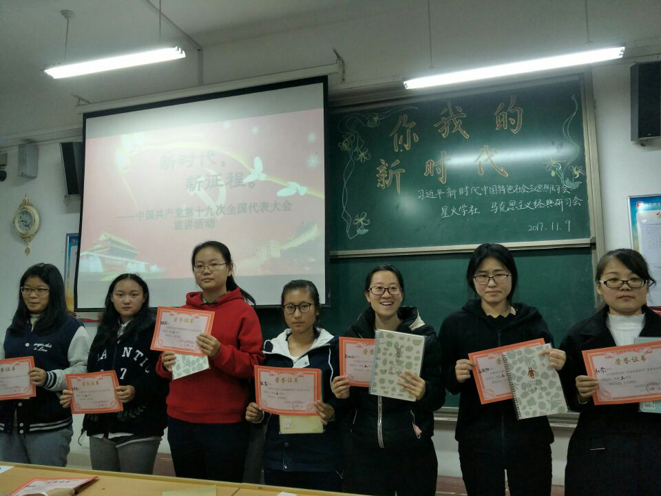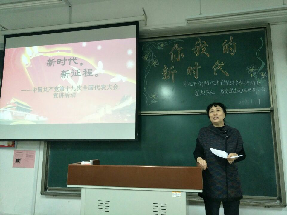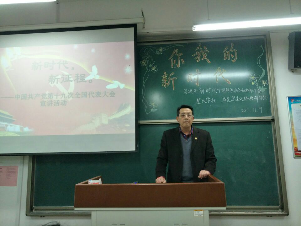 2017年11月9日,星火学社和马克思主义经典研习会在二号教学楼A310教室举办了关于“弘扬十九大精神,共创你我新时代”的宣讲活动。参加此次活动的有马克思主义学院党总支书记王晓梅教授、院长刘振光教授以及马克思主义学院2016、2017级全体成员。此次活动由星火学社组织部部长纪文洁同学主持,历时三个小时,活动取得了圆满成功!