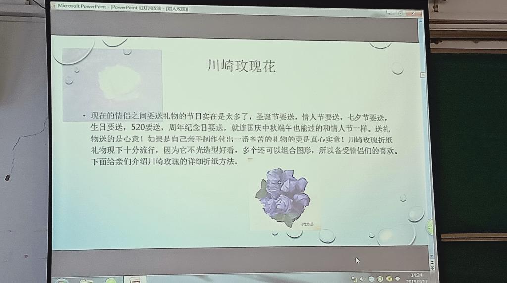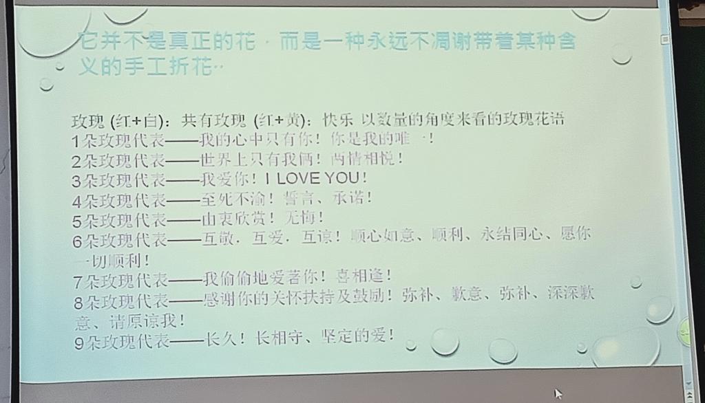 活动伊始,社长蔡双云首先向所有参加的社员们表示了热烈的欢迎。随着在屏幕上不断展示各种类型的川崎玫瑰,并带有各类玫瑰的花语。这场别开生面的折川崎玫瑰活动正式的拉开了序幕。