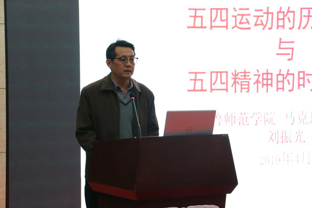 为深入学习贯彻习近平新时代中国特色社会主义思想,深入贯彻落实习近平总书记关于五四运动的历史意义和时代价值的讲话精神,425日,齐鲁师范学院国是讲坛举办题为五四运动的历史意义和时代价值的专题讲座,纪念五四运动100周年。讲座由我校马克思主义学院院长刘振光教授主讲,团委副书记赵旭辅讲,全校青年马克思主义者培养工程全体成员和入党积极分子近300人聆听了讲座。