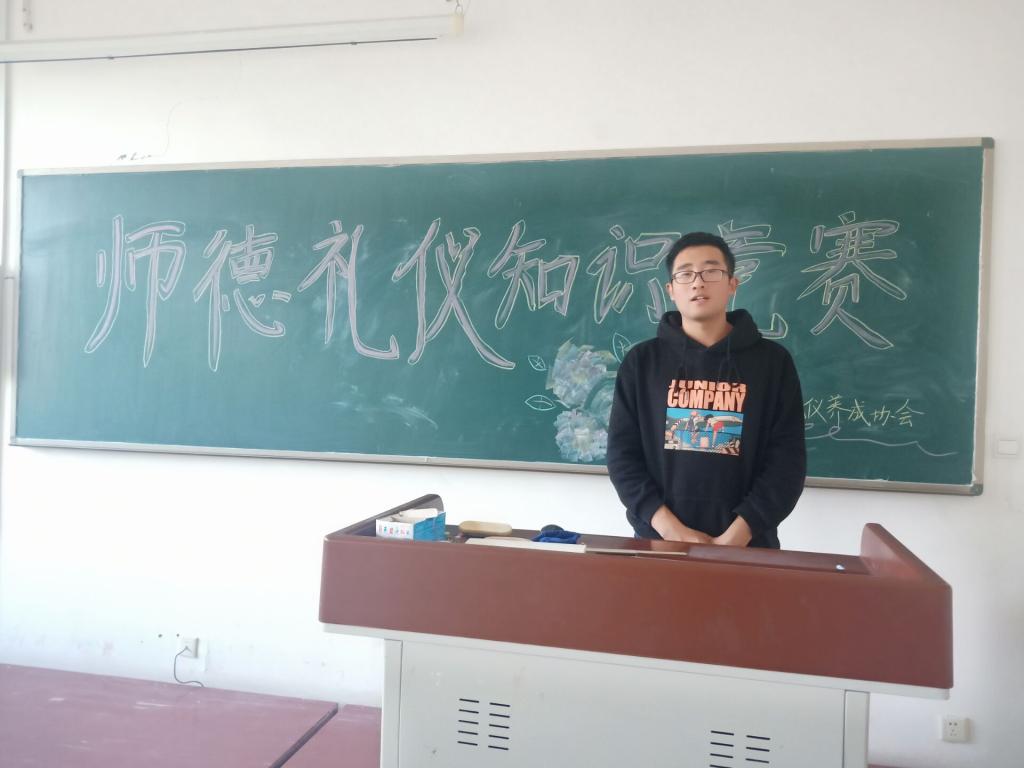 10月25日下午,我社在二号教学楼A310举行“师德礼仪”知识竞赛,竞赛由我社社长侯庆山主持,刘雨欣、杜伟欣和雷雨诺等8名同学参与了知识竞赛,日常师德礼仪养成协会全体成员参与了此次活动。