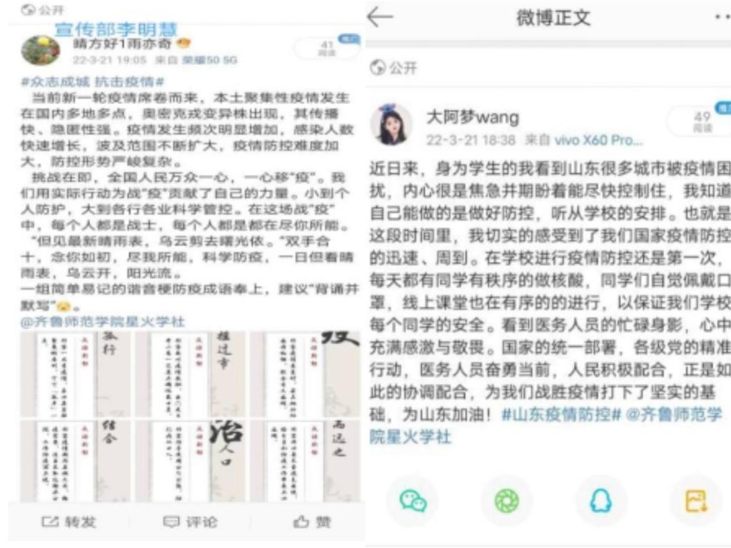2022年3月21日,马克思主义学院星火学社组织了“致敬抗疫人员,携手静待花开”微博撰写活动。参与此次活动的有星火学社全体成员。