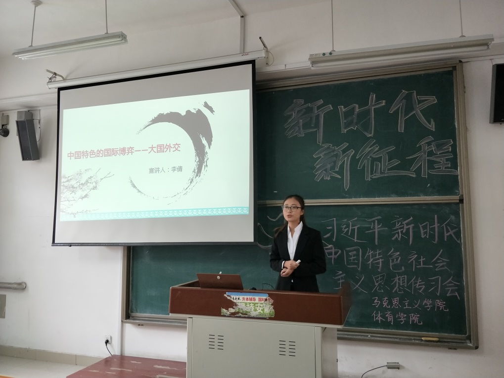 李倩同学的宣讲主题是“中国特色的国际博弈——大国外交”,她从多个方面深入剖析了我国外交方面的发展与成就。李倩同学将内容划分为十九大报告思路,中国外交史和新时代中国特色外交三方面,并对新时代中国特色外交进行了着重讲述,阐述了顶层设计的新型国际关系和人类命运共同体的具体内容。最后 她列举了十九大结束后特朗普访华对我国外交的意义,使大家对我国外交发展有了更深刻的认识。