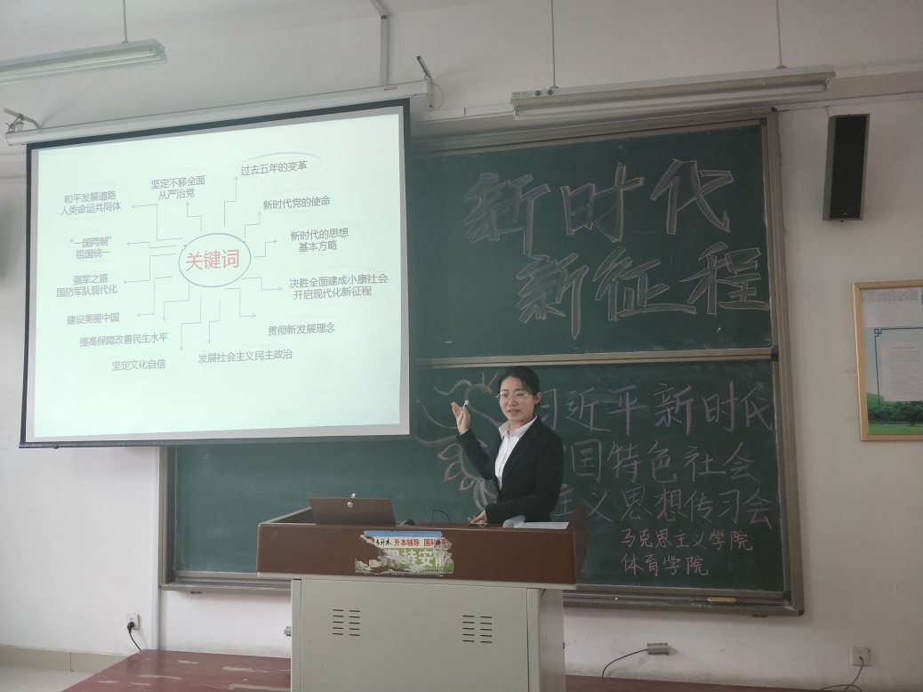 为进一步宣传十九大精神,使更多的青年大学生了解十九大精神,2017年11月30日,马克思主义学院,体育学院以及习近平新时代中国特色社会主义思想传习会在2号教学楼A317教室联合主办了以“新时代新征程”为主题的十九大宣讲活动。参与本次活动的有马克思主义学院习近平新时代中国特色社会主义思想传习会成员以及体育学院学生。